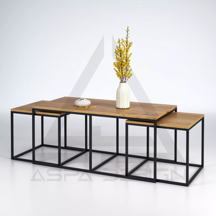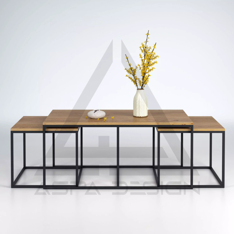 این مدل میز جلومبلی مجموعه ای سه عددی میباشد که دو میز عسلی آن از طرفین، زیر میز بزرگتر قرار میگیرند. پایه ها به رنگ مشکی کوره ای الکترواستاتیک هست و صفحه ی رویی ملامینه قهوه ای رنگ طرح چوب است.